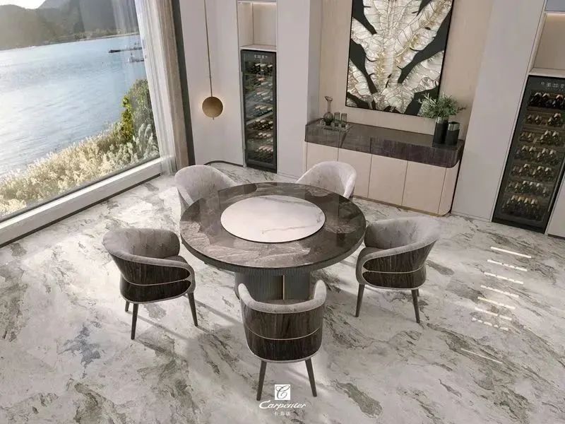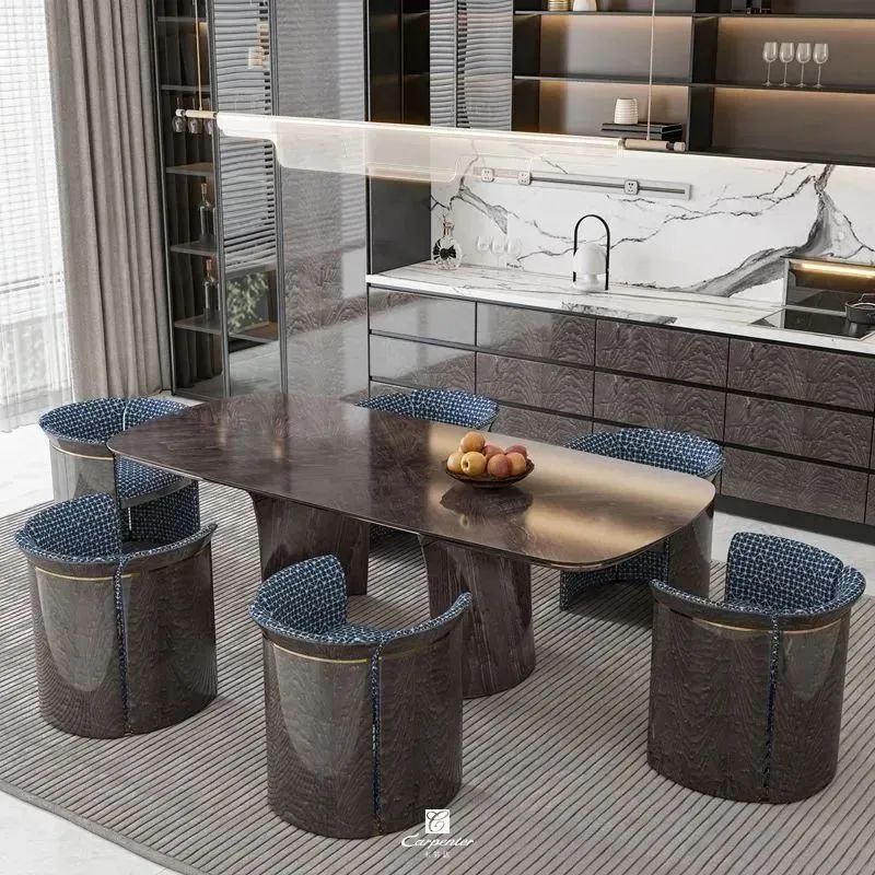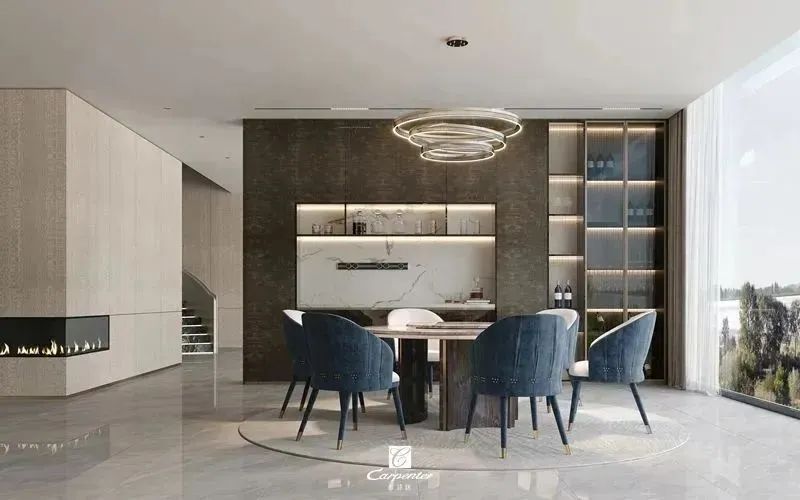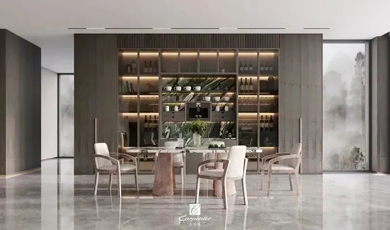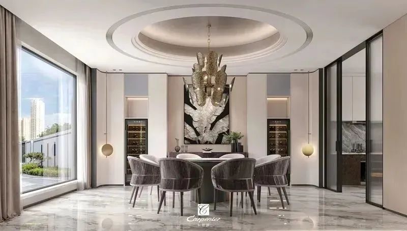 設(shè)計(jì)師通過材質(zhì)選擇、色彩運(yùn)用和軟裝搭配,演繹高級(jí)輕奢風(fēng)。注重空間與功能的結(jié)合,餐邊柜、酒柜及餐桌椅井然有序、整齊劃一,滿足用餐、收納、展示等多重需求。