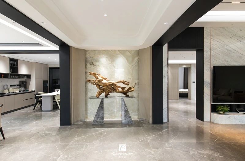 會客廳摒棄繁冗復雜,以素雅的基底,凸顯材質與工藝本身。真皮沙發與奢石茶幾搭配,演繹多樣層次,呈現特殊的清冷美感。