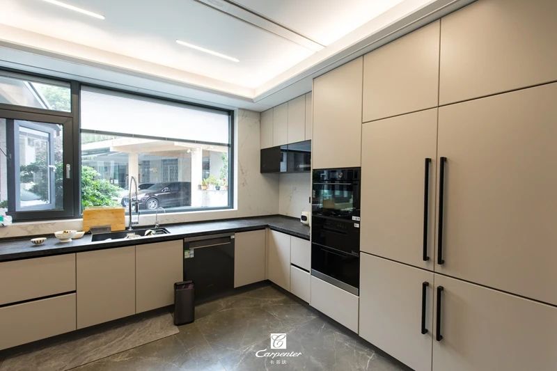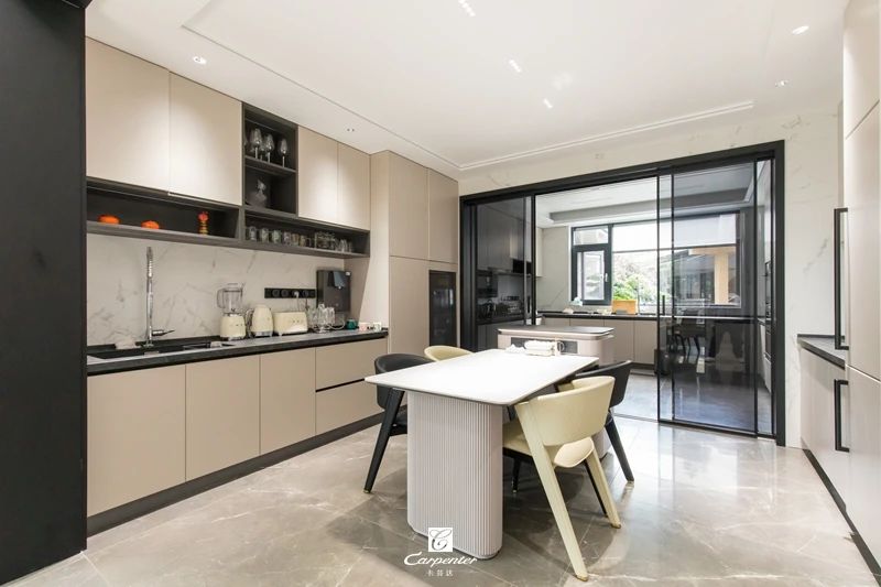 水吧休閑區與廚房相連,以多樣的展陳方式提升格調,在定制柜與石材餐臺碰撞、線條和飾面交錯間,打造出時尚、豐富的烹飪享食間,唇齒留香,視覺盛宴。
